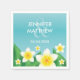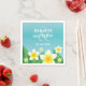 Tropical wedding theme napkins featuring Destei's illustrated white and yellow frangipani plumeria flowers with green leaves. There are personalizable text areas for the names of the couple that is getting married and for the date of the wedding. The background colour is a lovely blue.