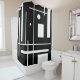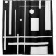 This white on black abstract art shower curtain is made with white geometric shapes on a background of black, created by artist Kirt Tisdale.