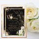 Gorgeous white botanical floral spray with sparse gold leaves over hanging this beautiful wedding invitation on black background. The rustic background is such a rich classy look. This is a lovely invitation. Trimmed in faux gold glitter to set the tone for romantic and classic elegance. Gold splashes finish off this pretty wedding invitation. Beautiful for any season.
