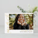 Elegant horizontal gold foil graduation invitation in white personalised with one photo on the cover and two more photos on the back. Double sided graduation invitation printed with gold foil against a white background. 2 in 1 graduation announcement and invitation personalised with photos and the graduate's name in gold foil.