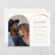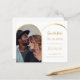 On front: Add your own vertical size photo. A faux gold photo arch frame. A classic white background, golden text. Personalise and add your nams and the date.