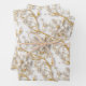 A trio of wrapping paper sheets with a beautiful and elegant design of white floral blooms edged with faux gold flowing in a diagonal pattern across the white background. This generativecontent 3D graphic is ideal for chic and timeless white and gold wedding celebrations. It is suited to summer and spring anniversaries, engagements and any formal, upmarket event you may be hosting too.