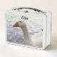 Photographs of a white goose on one side and a male wood duck on the other side adorn this customisable lunch box!