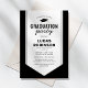 Elegant academic graduation party invitations featuring a classic black background, a white graduation sash centrepiece, a mortarboard cap, and a modern text template that is easy to personalise.