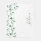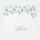 A chic white background with watercolored green coloured springs with leaves, foliage. Your name is written with a large modern hand lettered script, signature style. Green coloured letters. Simple and minimalistic.