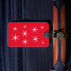 An outline drawing of white heart snowflakes outlined in red, is printed on a red background on personalised luggage tags. The contact info is easily customised on the template form, for the back.