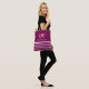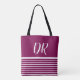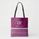 A stylish and modern design for a tote bag with white horizontal stripes on wine background, personalised with her name and initials (handwritten font style)