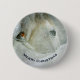 Merry Christmas button with a serene photograph featuring a beautiful white horse with a little bird resting on his neck. A magical winter snowfall gives the image a wonderful mystical quality.