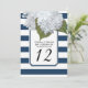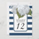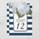 Table Numbers for your bridal shower, birthday party, wedding reception or other formal event. Hand painted white hydrangeas are paired with wide modern striped pattern in Navy blue and white with a tiny silver glitter outline. An art deco inspired notched corner frame finishes off the design. copyright, Audrey Jeanne Roberts.