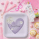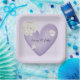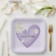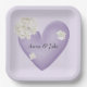 White hydrangea blossom on purple watercolor heart with names and wedding date for anniversary party/.