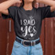 I said yes tee for the future mrs with a charming white typography design with a diamond dotting the i and a little heart below the yes. Bachelorette party typography t-shirt for the bride to be. Bride to be t-shirt with I said yes in a white typography design.