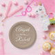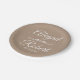 Handwritten typography white flowers kraft paper rustic floral wedding paper plate. It showcases your names in a cursive script handwritten style typography and two small white flowers with leaves on both sides of the ampersand.