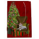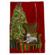 Cute white Jack Russell Terrier sits in a chair guarding the Christmas tree and the Christmas presents dog lovers Christmas holiday gift bag