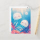 This heartwarming design features two incredibly sweet and round jellyfish shown swimming joyfully through a sun-drenched underwater paradise. Created in a soft, whimsical style, the main jellyfish have translucent white bells with blissfully happy faces, small smiling mouths, and bright purple eyes. Their long, wavy white tentacles flow gracefully through the crystal-clear turquoise and blue water. The characters are accompanied by a smaller jellyfish friend and surrounded by a lush garden of hand-painted pink, blue, and purple coral reefs at the bottom of the frame. Beams of bright golden sunlight filter down from the surface, illuminating the scene and creating a cheerful, magical atmosphere filled with soft bubbles and light particles. The overall aesthetic is bright, cozy, and full of wonder, making it an irresistible choice for fans of marine life and playful ocean art. This cheerful jellyfish postcard is a wonderful choice for sending a warm "thinking of you" note or a sun-drenched greeting to a friend who finds joy in the colorful magic of the sea. You might choose to use this artistic card for an under-the-sea themed birthday invitation or as a sweet way to share news of a summer beach trip with your family. It also makes a precious decorative piece for a child's nursery wall or a bright addition to a creative scrapbooking project as a small token of aquatic happiness. This versatile design is also an excellent choice for a holiday thank you note, a birthday message, or as a heartwarming way to share a message of joy for any situation or event.