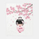 Vector illustration of a cute oriental girl in a light pink/white bridal kimono dress with a dark red undergarment. The girl's black hair is decorated with flowers and geisha style hairpins. This artwork was inspired by traditional kokeshi dolls of Japan. Blooming Sakura cherry tree makes a simple background.
