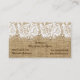 White lace and pearls on linen burlap business card template design that features white lace and pearls on linen neutral beige burlap or hessian. Text in brown. Note that lace, burlap, flower and jewel are all “printed on” and not real fabric, metal, gem or crystal. This elegant, sophisticated and romantic design with a rustic essence is fully customisable and is perfect for personal or professional use.