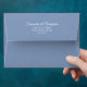 This beautiful wedding envelope is features a dusty blue or periwinkle coloured background with white floral curls and swirls on the inside flap. There is a printed return address on the back flap in fancy script lettering. The design is understated and simple, yet classic, chic and ornate. Perfect way to make your wedding invitations all the more special.