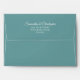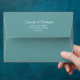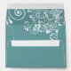 This beautiful wedding envelope is features a teal or turquoise coloured background with white floral curls and swirls on the inside flap. There is a printed return address on the back flap in fancy script lettering. The design is understated and simple, yet classic, chic and ornate. Perfect way to make your wedding invitations all the more special.