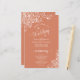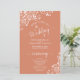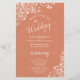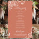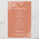 These wedding programs are elegant and tasteful, while still being budget friendly. The design features an ornate white floral lace pattern on a terracotta or coral orange coloured background. The typography features lacy script calligraphy, and there is room for details on the ceremony, the bridal party, and a short thank you.