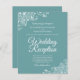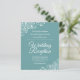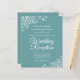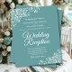 These affordable, budget friendly wedding reception invitations are the perfect choice for class, style, and beauty on a budget. Designed for guests who are invited to the reception but not the ceremony, they feature a beautiful teal or turquoise coloured background with ornate white faux lace frills in the corners. The typography includes fancy script lettering for a style that is at once simple and elegant. Wonderful way to invite your friends and family to share in your joy on your special day without breaking the bank.