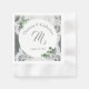 White Lace and Rose Leaves design features names of couple in elegant silver text displayed as an arch against a white backing. Background features the image of white lace. Centre displays initial of the couple's last name. Wedding date is displayed below. Green rose leaves are delicately positioned at the edges.