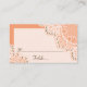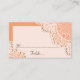 Elegant white lace with pearls coral orange wedding seating place card featuring white lace on coral orange that covers two corners of a white rectangle with coral orange border. Text in brown. Note that lace is “printed on” and not real fabric. This elegant, shabby chic sophisticated and romantic design is part of a wedding set and is perfect for a chic spring, summer or fall/autumn wedding.