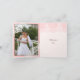Elegant white lace with pearls pink wedding Thank You photo note card featuring white lace with beige/ecru pearls on soft pink that covers two corners of a white rectangle with pink border. Your photo is on the left inside. Text in brown. Note that lace is “printed on” and not real fabric. This elegant, shabby chic sophisticated and romantic design is part of a wedding set and is perfect for a chic spring, summer or fall/autumn wedding.