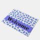 Welcome visitors to your home with this stylish and sophisticated periwinkle lavender purple, turquoise and white leopard skin pattern door mat. This door mat is customised with the word Welcome that you can change to another word or name. A periwinkle lavender purple strip gives an area for personalisation and a pop of colour. Enjoy this popular and contemporary design that will add a trendy home decorative accent. This leopard design is available in several colour combinations in this store.