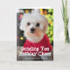 White Maltese dog in red Santa Claus suit. Holiday Card