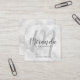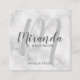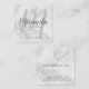 This business card features monogram and name in grey modern script font style with business information in grey modern sans serif font style on white marble background.