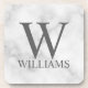 features personalised monogram and name in grey classic serif font style on white marble background.