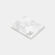 features personalised monogram and name in grey classic serif font style on white marble background.