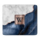 Elegant white marble and navy blue agate trimmed with faux rose gold glitter combine in this luxurious design. Personalise it with your initial in navy blue serif font in a double-bordered rose gold faux brushed metal square frame.