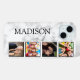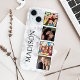 Create your own personalized 4 photo collage phone case with your custom images and name on a stylish elegant white marble background.