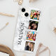 Create your own personalized 4 photo collage phone case with your custom images and name on a stylish elegant white marble background.
