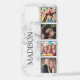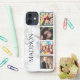 Create your own personalized 4 photo collage phone case with your custom images and name on a stylish elegant white marble background.