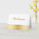 It is white minimal with gold stripes presence having white background would give elegant appearance in saying welcome to your loving one.