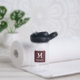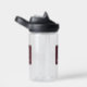 Small water bottle with white name and monogram on a dusty burgundy rounded square, on both front and back.