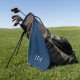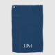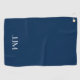 Golf towel with white three initial monogram or name on a navy blue background. Personalise with your three initial monogram or name using the easy template. Font colour, font style, and font size are customisable.