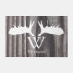 Weathered old grey wood print background with white moose antlers silhouette and your personalised family name and monogram in white.