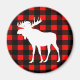Rustic fridge magnet with a white moose silhouette over a black and red buffalo check plaid pattern.