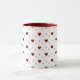 11oz white mug featuring a playful pattern of dark red hearts and tiny light red circles, with a matching dark red handle and interior. Perfect for cozy coffee moments or as a charming gift.
