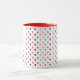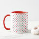 11oz white mug featuring a playful pattern of small hearts in dark red, cool red, dark gray, and light gray, with a red handle and red interior. Perfect for cozy coffee moments or as a stylish gift.