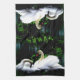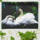 Fine art photography featuring two elegant white, black and orange mute swans in a lake is edited to give it a painterly effect. Rich green foliage and ripples set the background as the sky and trees create reflections on the dark water.
