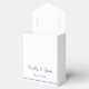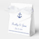 White nautical wedding favour boxes (tent favour box with white ribbon) with anchor and customisable text - you can add bride's and groom's name and wedding date.
