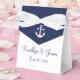 White and navy blue nautical wedding favour boxes (tent favour box with white ribbon) with anchor and customisable text - you can add bride's and groom's name and wedding date.