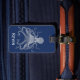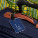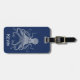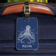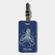 Dark blue luggage tag with graphics of a white octopus, on the front and custom white text, on the front and back.