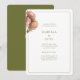 Modern and trendy with vintage feel. This lovely wedding invitation features a bouquet of voluptuous rose accents against chic white and olive green backgrounds. The set of contemporary fonts exude a stylish modern elegance. Personalise with wedding website and RSVP detail at the back.