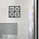 Bold geometric pattern features four white squares with space between them on a black background. The diagonally opposed thick squares each contain a thin white circle with a thick equal sign inside. In contrast, the thin squares each contain a thick white circle that touches the square’s edges with a thin vertical equal sign inside.