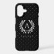 Destei's tiny white polka dots pattern on a black background color paired with a personalizable monogram and name. The monogram sits within a classic laurel wreath with the name placed just below for a balanced, polished look. A timeless choice for anyone drawn to a clean, elegant style.